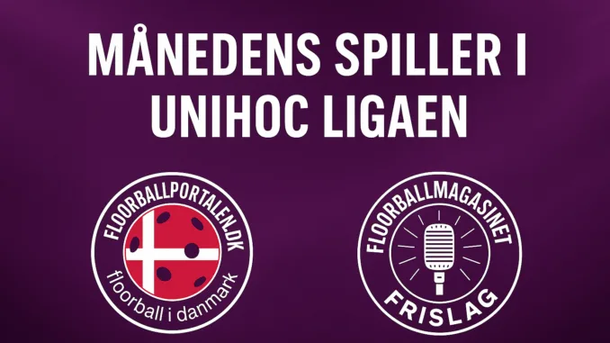 Floorballportalen.dk kårer i samarbejde med Floorballmagasinet Frislag månedens spiller i kvindernes Unihoc Ligaen. Vi har brug for alle vores mange læsere her på Floorballportalen.dks mening. Derfor har vi nominerede 5 spillere, som vores læsere nu kan stemme på, og være med til at afgøre, hvem der skal være månedens spiller i Unihoc Ligaen for kvinder.